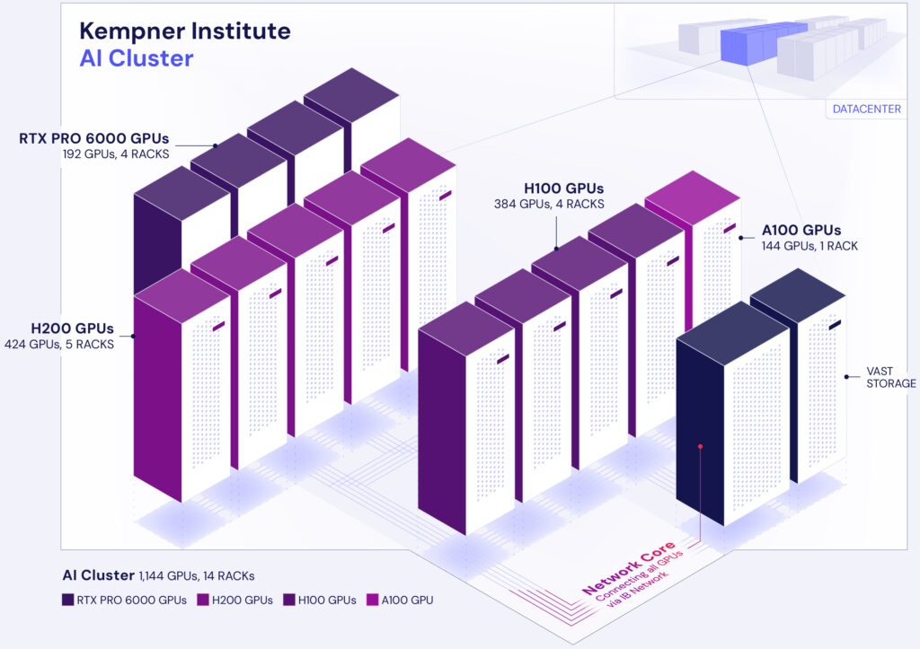 The Kempner Institute AI cluster is one of the largest and fastest academic AI clusters in the world with 1,144 GPUs– a mix of H200, H100, A100, and RTX Pro 6000 Blackwell architectures—providing a theoretical peak performance of 1.8 ExaFLOPS (BF16).
