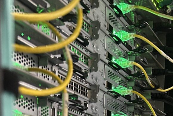 Network switches inside one of the H100 nodes in the Kempner Institute's AI Cluster. Recipients of the accelerator awards receive cluster computing resources at a scale that is otherwise unavailable to faculty and typically too costly to pursue in a cloud-based environment.