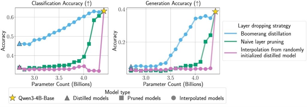 Today’s large language models power everything from chatbots on your phone to massive AI systems running in data centers. But not all devices can handle the same model sizes: a model that’s fast on a GPU cluster might be unusable on a laptop. AI model developers try to solve this by releasing “model families” consisting of different-sized versions of the same model. For example, Llama3 models come in sizes ranging from 1 billion to 70 billion parameters. Yet training each size from scratch is expensive, leaving big gaps between available models. What if we could fill those gaps without any extra training? That’s exactly what we explore with Boomerang Distillation, a new way to “recombine” parts of large and small models to create many intermediate sizes – all from a single training run.