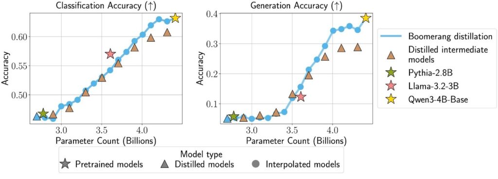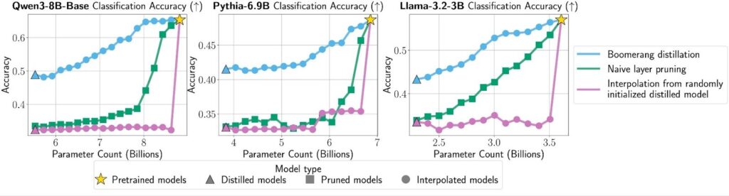 We find that across multiple model families and sizes, boomerang distillation creates intermediate models whose performance interpolates smoothly between the student and teacher (Figures 3 and 4). In contrast, both baselines’ performance sharply decreases with model size. This shows that both ingredients – the right initialization and knowledge distillation – matter. Leave out either step and the boomerang effect largely disappears.