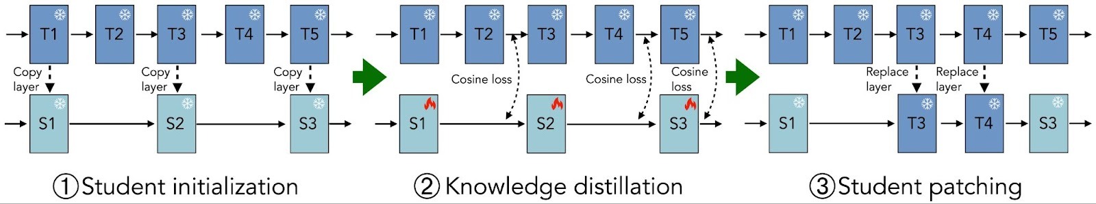 Boomerang distillation consists of three key steps: (1) student initialization, (2) knowledge distillation, and (3) student patching (Figure 2). We explain each of these steps in detail below.