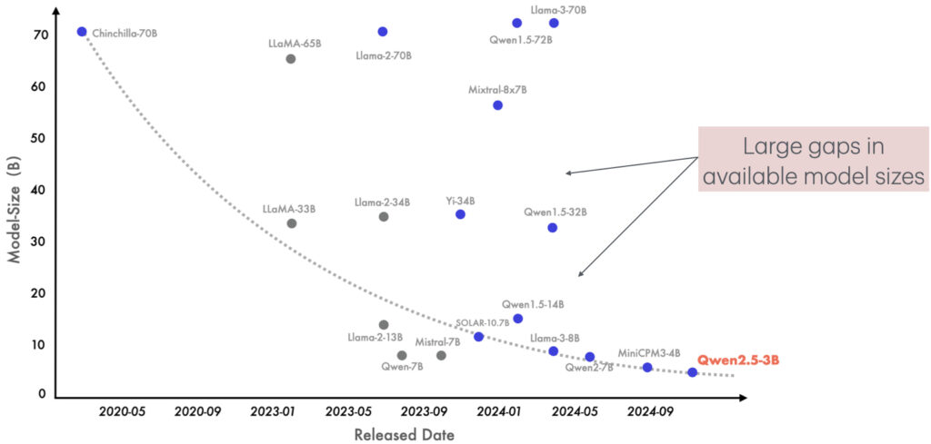 Figure 1: The landscape of pretrained LLM families. There are large gaps in size between available LLMs. Figure credit: https://qwen.ai/research