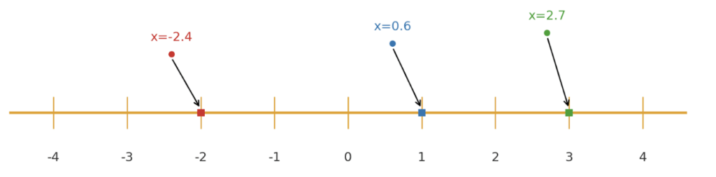 Quantization alleviates this issue by mapping these high-precision weights to low-precision formats: instead of using 32 bits per number, we might use 8 or even 4 bits. For a simple example, consider the numbers -2.4, 0.6, and 2.7. Assume that our quantization bin thresholds are integers between -4 and 4. Then our three numbers would be rounded to the nearest integers -2, 1, and 3 as shown in Figure 1 below.