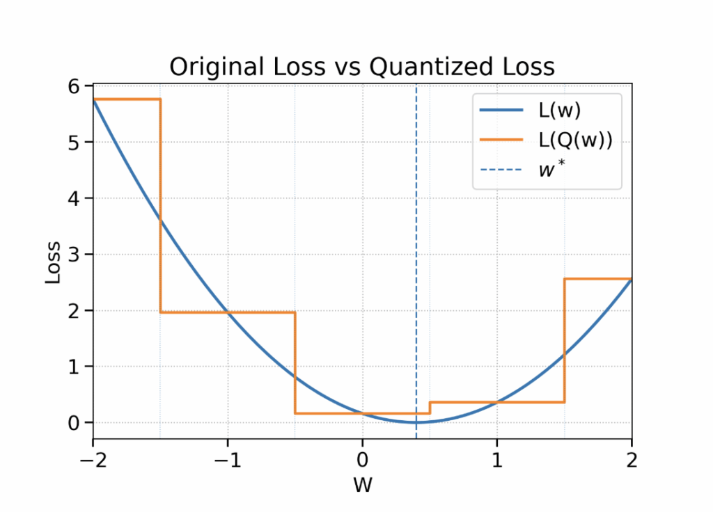 Unlike in this simple toy example, quantizing the minimizer of L(w) for complex, real-world models generally does not minimize L(Q(w)). QAT therefore targets the quantized objective directly. However, as shown in the figure, quantization renders the loss surface piece-wise constant, so the objective is non-differentiable: gradients are zero everywhere except at quantization thresholds where they are undefined. To optimize this objective, QAT must rely on the straight-through estimator (STE). QAT methods typically compute the gradient directly with respect to the quantized weight, treating the quantization operation as the identity (pretending $\frac{\partial Q}{\partial w} \approx 1$). Despite some empirical success, these naive STE-based methods are unprincipled and tend to become unstable at low bitwidths.