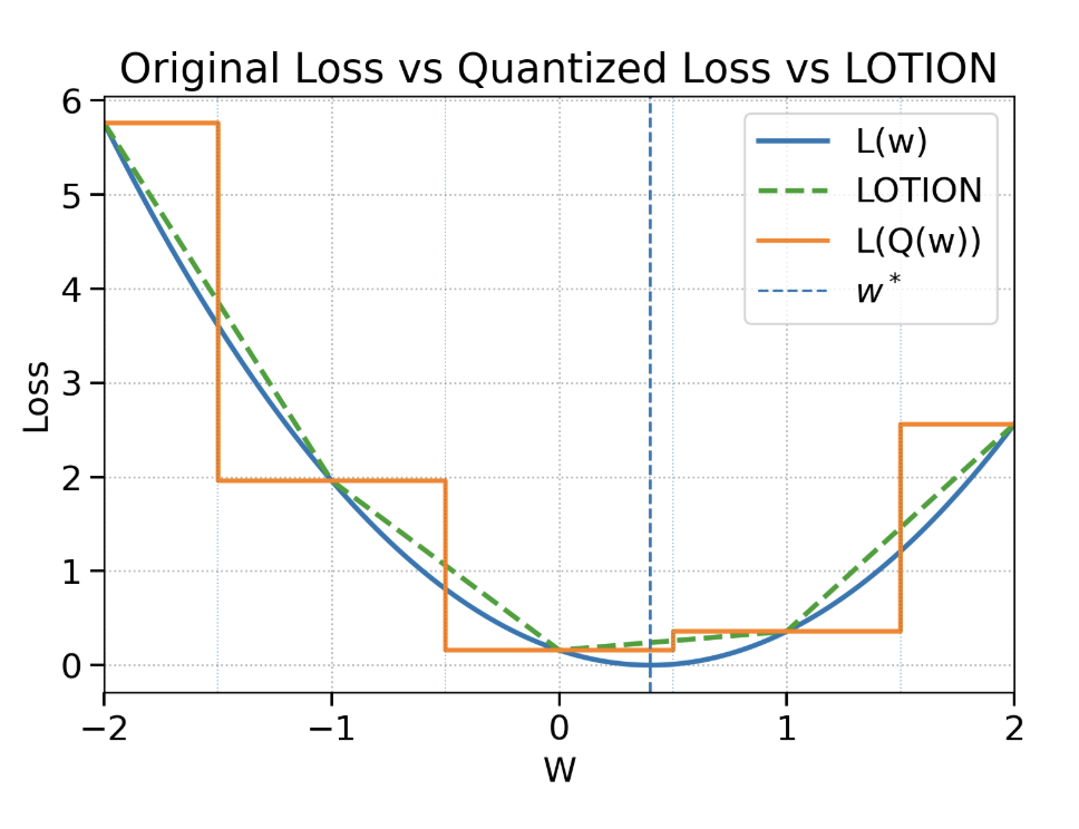 In our paper, we introduce LOTION – Low-precision Optimization via sTochastic-noIse smOothiNg – a method that smooths the quantized loss, eliminating the need for the STE. Recall that the core problem with quantization is that it transforms a smooth loss landscape into a giant staircase, as shown in Figure 2. On the flat part of each step, the gradient is zero, and at the sharp edges, it’s undefined. An optimizer like SGD tries to walk down this staircase but has no local signal of where to go. QAT provides a gradient signal, but STE-based updates can be very brittle, particularly when the steps in the staircase are relatively large (e.g. in lower precision). Consider a point on the lowest step on the staircase. This point minimizes the quantized loss, but QAT may yield a gradient that can push us out of this step into a range where the quantized loss is higher.