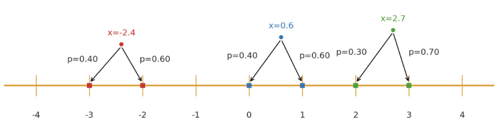 The randomized-rounding operation rounds values up or down to the nearest quantization bins with probability proportional to the distance from each bin. Referring back to the quantization example, randomized rounding would individually round each of our values -2.4, 0.6, and 2.7 to their corresponding lower or upper integer thresholds with the probabilities shown below in Figure 4.