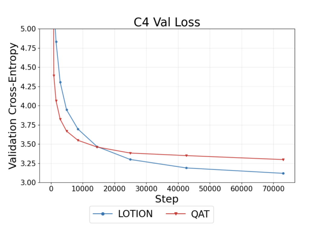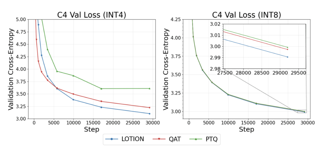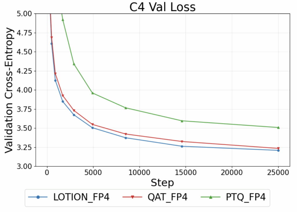 We validate LOTION’s performance on 150M- and 300M- parameter language models against two baselines: 1. standard QAT with the STE and 2. direct quantization after training in full precision (PTQ). In our paper, we compare these methods at three different levels of precision: INT8, INT4, and FP4.
