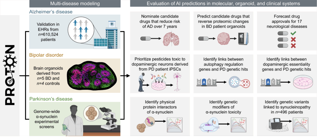 We used PROTON to generate hypotheses in Parkinson’s disease, bipolar disorder, and Alzheimer’s disease and related dementias. We evaluated these hypotheses using genome-scale molecular screens, patient-derived brain organoids, and longitudinal electronic health record data. To our knowledge, no prior study has paired a foundation model with experimental and population-scale evaluation at this breadth and scale.