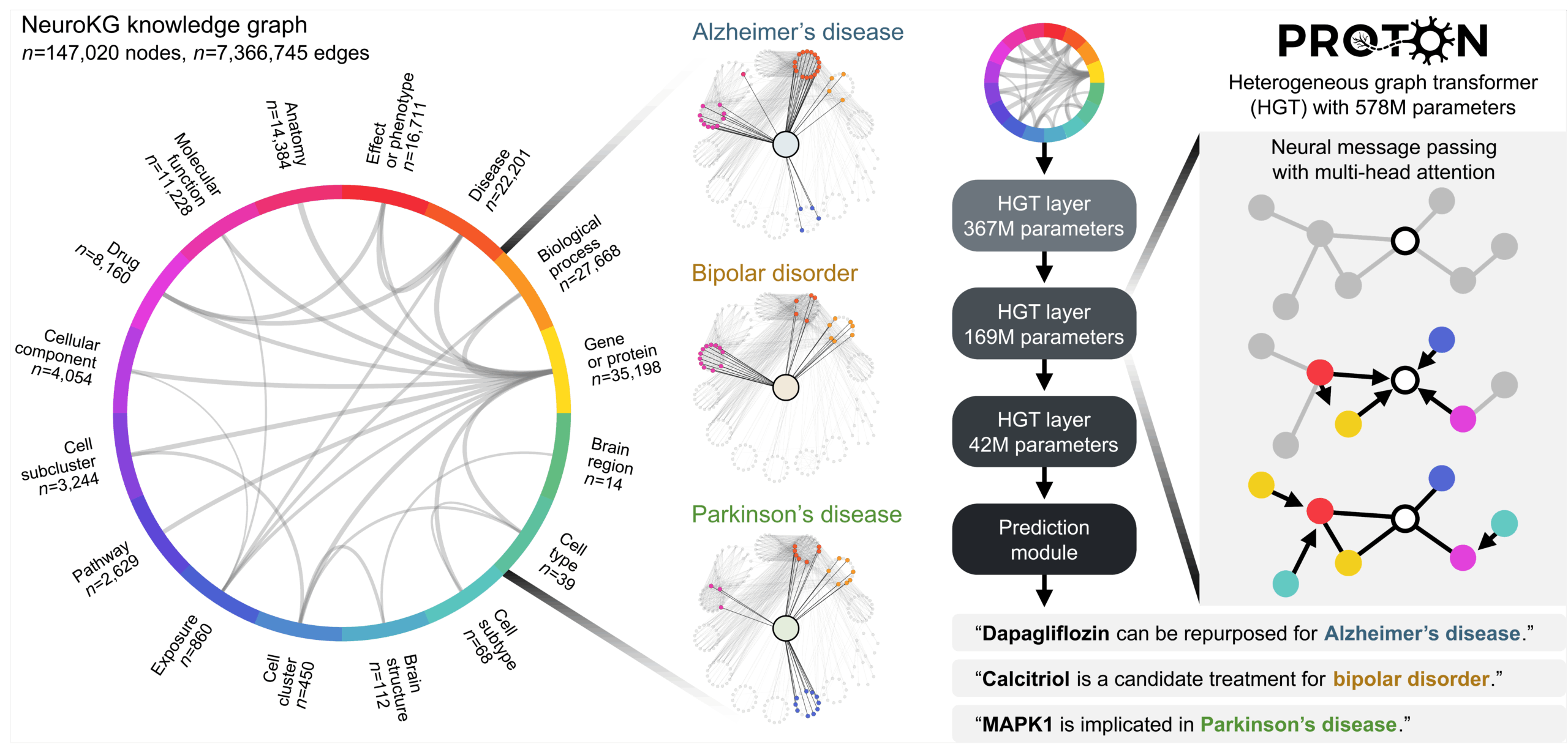 This changes the modeling problem. Instead of asking the model to map (input token sequence) → (next token in the sequence), we ask it to map (seed node + graph context) → (hypothesis linked to the graph context). Through neural message passing with attention, PROTON propagates information across millions of graph contexts, learns which neighbors and relation types are most informative, and uses multi-hop graph context to generate predictions.