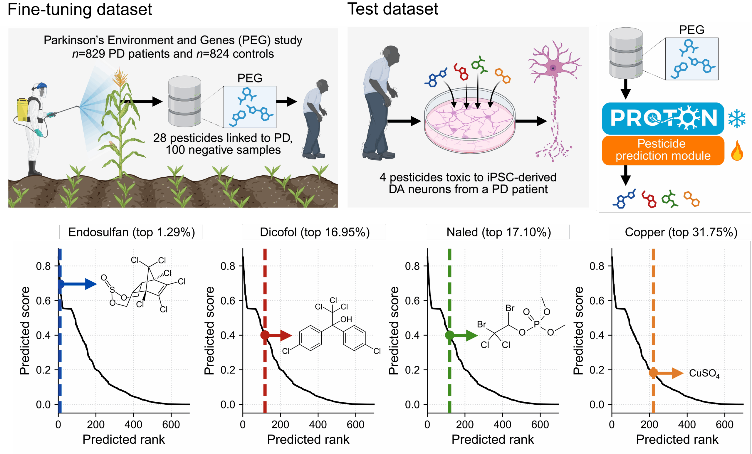 We then applied the same relational reasoning approach to ask how environmental pesticide exposure influences dopaminergic neuron health and alters Parkinson’s disease risk. After a few-shot adaptation using a dataset of 28 pesticides from epidemiological analyses of agricultural exposure and PD incidence, PROTON evaluated pesticide graph context and predicted candidate neurotoxicants, including endosulfan, ranked within the top 1.29% of all chemicals (Figure 4). We tested these predictions in patient-derived dopaminergic neurons, linking population-level exposure signals to cell-type-specific molecular toxicity.